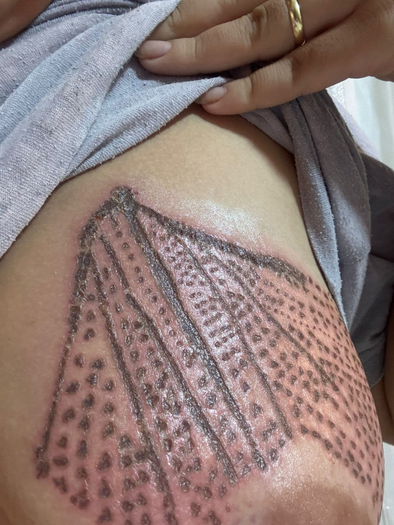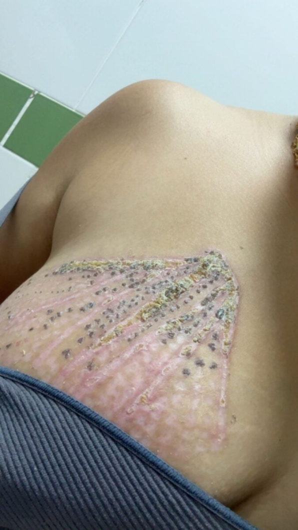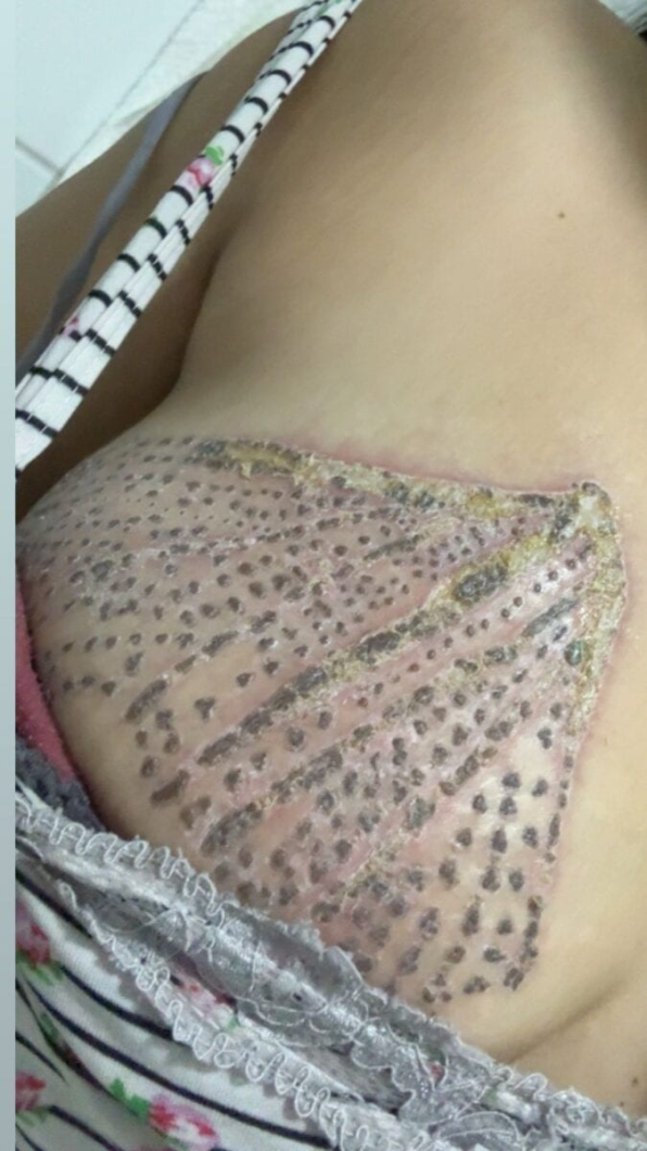 Segundo Vanessa, ela buscou o tratamento com jato de plasma para tratar flacidez mamária após duas gestações. A profissional prometeu resultado em cinco dias, com aparência superficial e sem lesões.