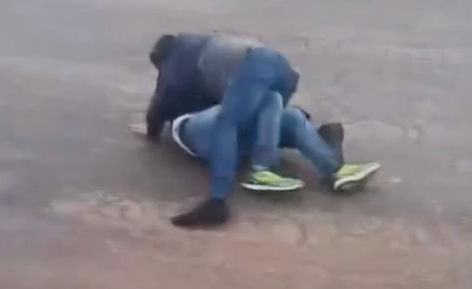 A situação rapidamente escalou para agressões físicas, chamando a atenção de pessoas que passavam pelo local. No vídeo, é possível ver os dois homens no chão, enquanto testemunhas observam a cena sem interferir diretamente.