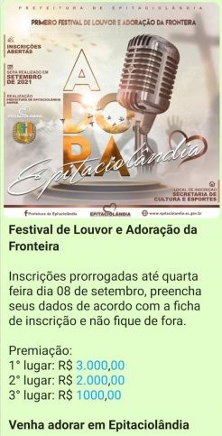 Com a participação de vários líderes religiosos das cidades de Brasileia, Epitaciolândia, Assis Brasil e Xapuri, abertura do 1º Festival de Louvor e Adoração da Fronteira, além de abençoado, promete ser um dos eventos mais movimentados do segmento nos últimos anos, será realizado no mês de setembro e data de inicio será divulgada nos próximos dias.