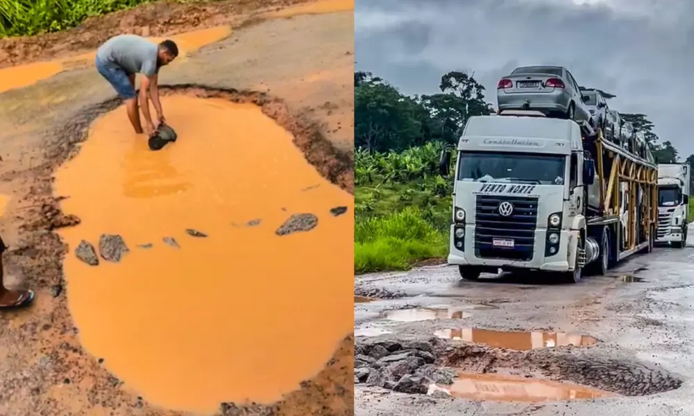 O caminhoneiro Arlisson Rocha, que transporta veículos entre as duas cidades, registrou a situação e relatou os prejuízos causados pelas falhas na estrada.