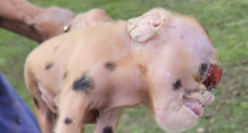 Tudo aconteceu, quando um filhote de porco acabou nascendo com a face deformada.