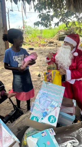 A ação levou alimentos, frango, peru chester, iogurtes, roupas e brinquedos, além de realizar o sonho das crianças de ganhar uma bebê reborn. A iniciativa garantiu não apenas a ceia natalina, mas também momentos de alegria e emoção para toda a família.