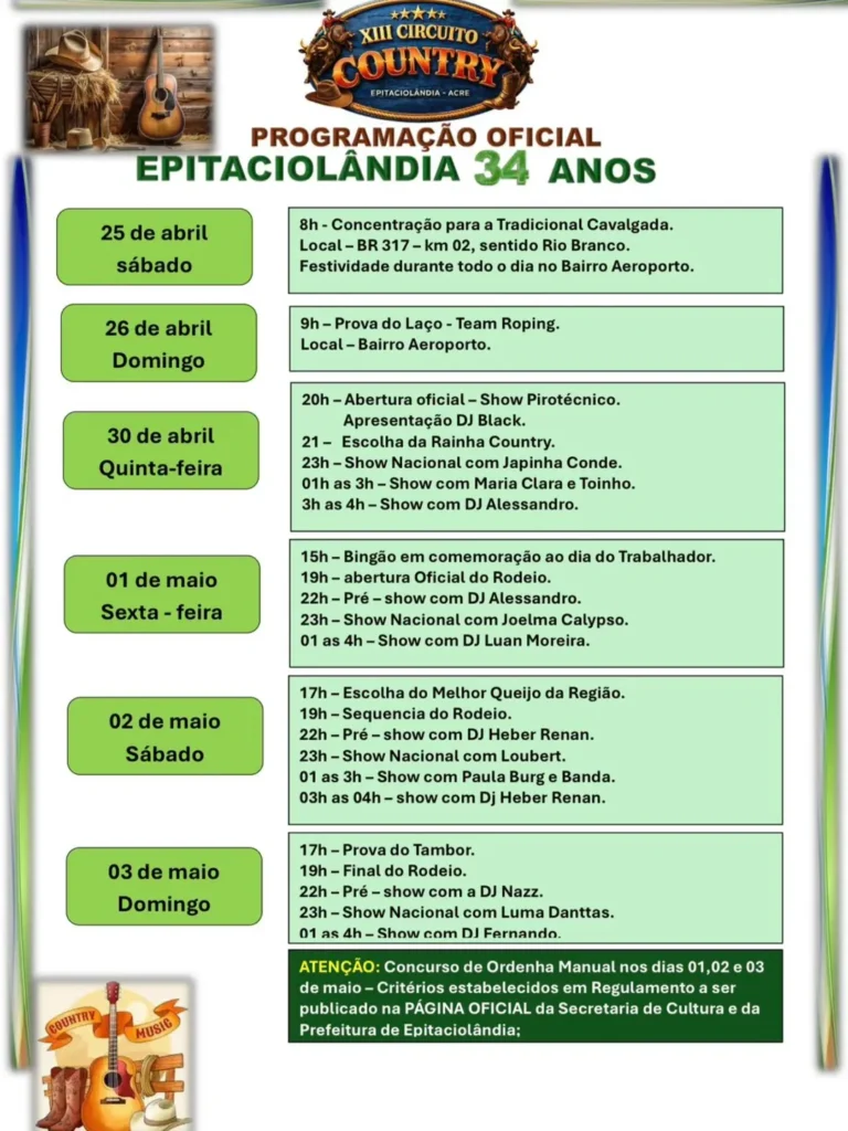 A Prefeitura de Epitaciolândia divulgou a programação oficial do XIII Circuito Country, em comemoração aos 34 anos do município. O evento promete movimentar a cidade com uma agenda diversificada, reunindo tradição, cultura e entretenimento para toda a população.