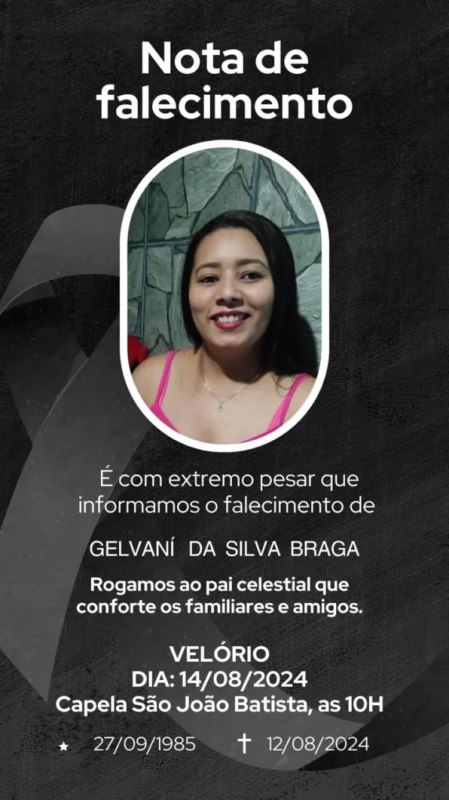 Gelvaní da Silva Braga, de 39 anos, morreu após ser atropelada por uma carreta na BR-101, no Espírito Santo, onde morava na última segunda-feira (12). Gelvaní é acreana e foi morar em outro estado para cursar Direito e melhorar de vida. A mulher trabalhava como merendeira.