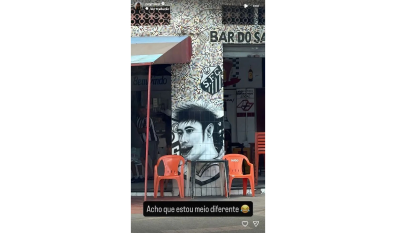 Neymar encontrou uma nova homenagem em um bar em Santos. O rosto do camisa 10 do Peixe foi desenhado em um mural, mas o retrato parece não ter ficado semelhante ao atleta. “Acho que estou meio diferente”, escreveu o craque junto com a imagem do grafite em suas redes sociais.