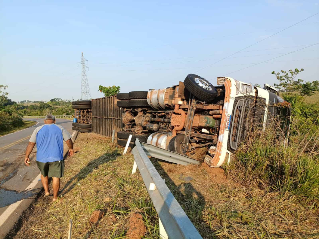 De acordo com informações preliminares, o veículo teria perdido o controle durante a madrugada e acabou virando na pista. Graças à defensa metálica instalada na lateral da rodovia — conhecida como guard rail —, a carreta não caiu em uma ribanceira, o que poderia ter provocado uma tragédia ainda maior.